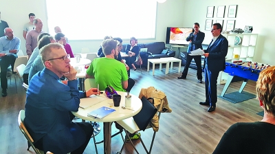 图为日内瓦技术创新基金会的早餐会,基金会总经理安东尼奥·康帕特拉正在向创业者们介绍情况。本报驻日内瓦记者 何农摄