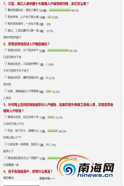 就在南海网发起的在线调查中,对于三亚、海口入选中国十大最难入户城市排行榜,90.1%的网友认为事实就是如此,难如上青天;仅9.2%的网友认为有些夸张,入户也不那么难。