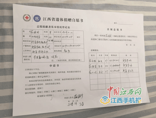 4月30日上午,新余市人民医院14楼肿瘤科病房,一位瘦弱的老人用久病无力的双手,一笔一划在遗体捐赠自愿书上签下自己的名字——蒋国珍。