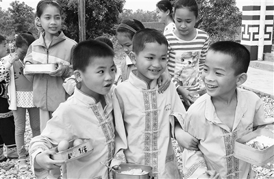 日前,广西武鸣县太平镇庆乐小学学生在阳光下享用营养午餐。校门口立着一块学生营养改善计划食品采购及菜谱公示牌,食谱、供货商信息清清楚楚,采购员、验收员责任到人,切实做到买得放心、做得细心、吃得开心。本报记者 周仕敏 张学军 摄