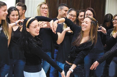 在孔子课堂成立仪式上,两组学习汉语的高中生演唱了中国歌曲。图为意大利学生正在演唱中文歌曲《月亮代表我的心》。