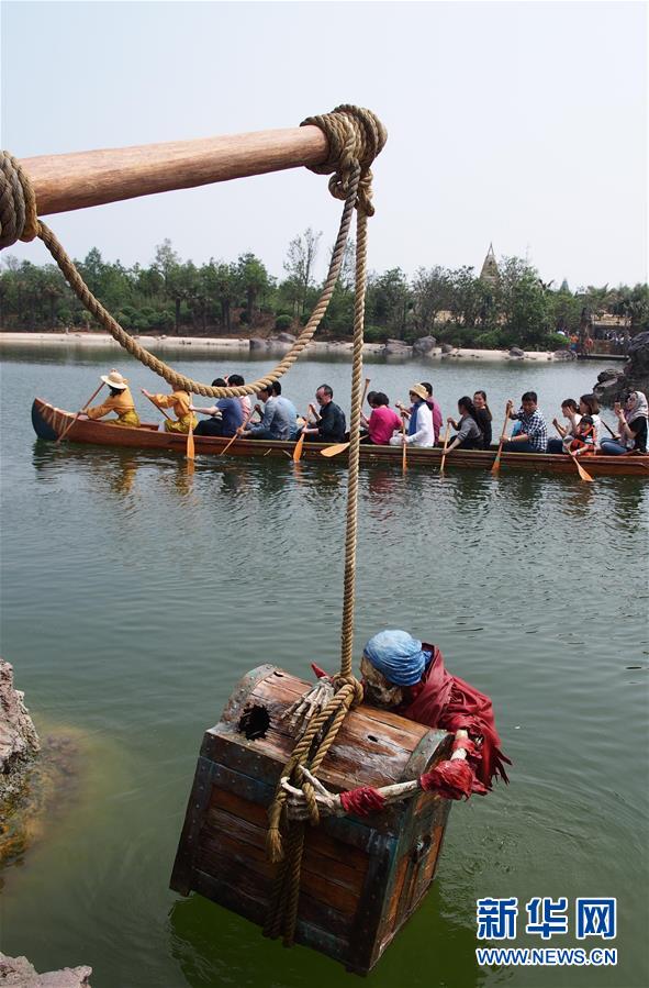 在上海迪士尼乐园里,参观者划着“探险家独木舟”驶入“宝藏湾”(5月11日摄)。 5月11日是上海迪士尼乐园的又一个内部测试日。在乐园运营管理方的安排下,上万名参加测试的乐园建设者及其家属参观了园内部分景点和游乐设施。据悉,上海迪士尼乐园将于6月16日开幕。新华社记者 任珑 摄