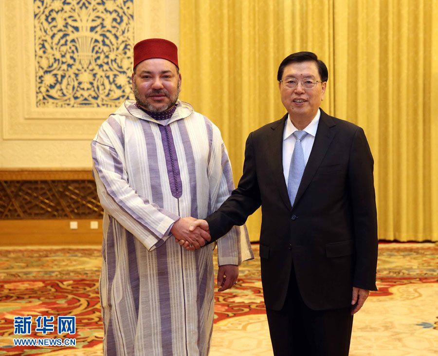 5月12日,全国人大常委会委员长张德江在北京人民大会堂会见摩洛哥国王穆罕默德六世。 新华社记者 刘卫兵 摄