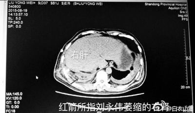 针对刘永伟“右肾缺失”,南京军区总医院检查报告显示:肝脏内后方与右侧膈脚间软组织影,考虑为外伤后右肾移位、变形、萎缩,其外侧软组织感染、窦道形成。专家组讨论意见为:患者胸腹部多脏器严重复合伤,多发性肋骨骨折,外伤性膈肌破裂,肝脏、右侧肾脏疝入胸腔,右侧肾脏挫裂伤、肝脏挫裂伤。术后第一天胸腹部CT、第五天腹部CT提示右肾存在并可见裂伤。