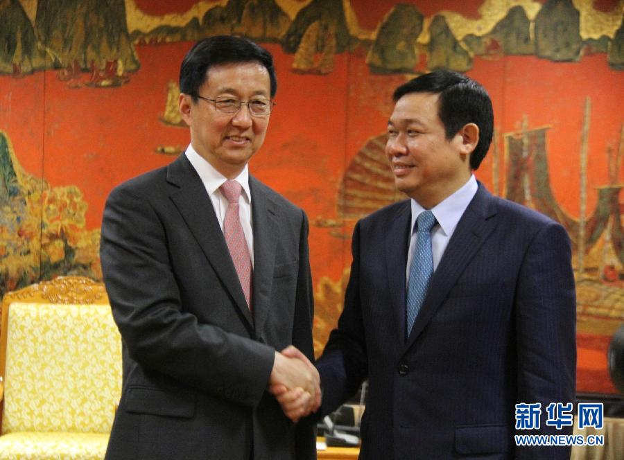 5月13日,在越南首都河内,中共中央政治局委员、上海市委书记韩正(左)会见越共中央政治局委员、政府副总理王庭惠。 新华社记者乐艳娜摄