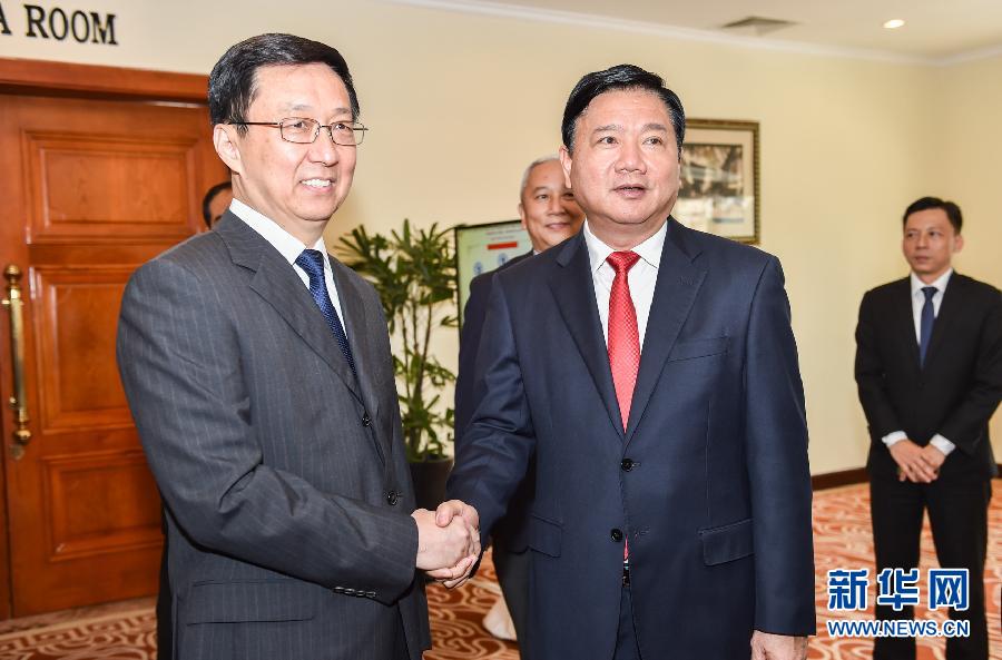 韩正同越共中央政治局委员、胡志明市市委书记丁罗升举行会谈