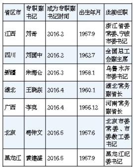 至少有7人在担任专职副书记前,曾担任市委书记。其中,江苏、江西和山东三地的副书记原来都在浙江担任市委书记,其他四位此前均为本省省会城市的市委书记。