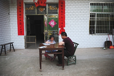 5月12日,赤塅完小校长尹鹏波每周来莎莎家里给她单独上数学课。A12-A13版摄影/新京报记者 薛珺