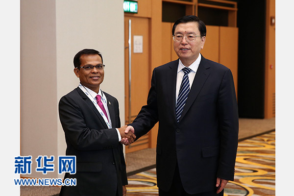 5月18日,全国人大常委会委员长张德江在香港会见马尔代夫议长马斯赫。 新华社记者 庞兴雷 摄
