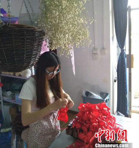 图为北京市朝阳区青年路附近的希曦花店店员胡燕正在为“网络情人节”忙碌。吕春荣 摄