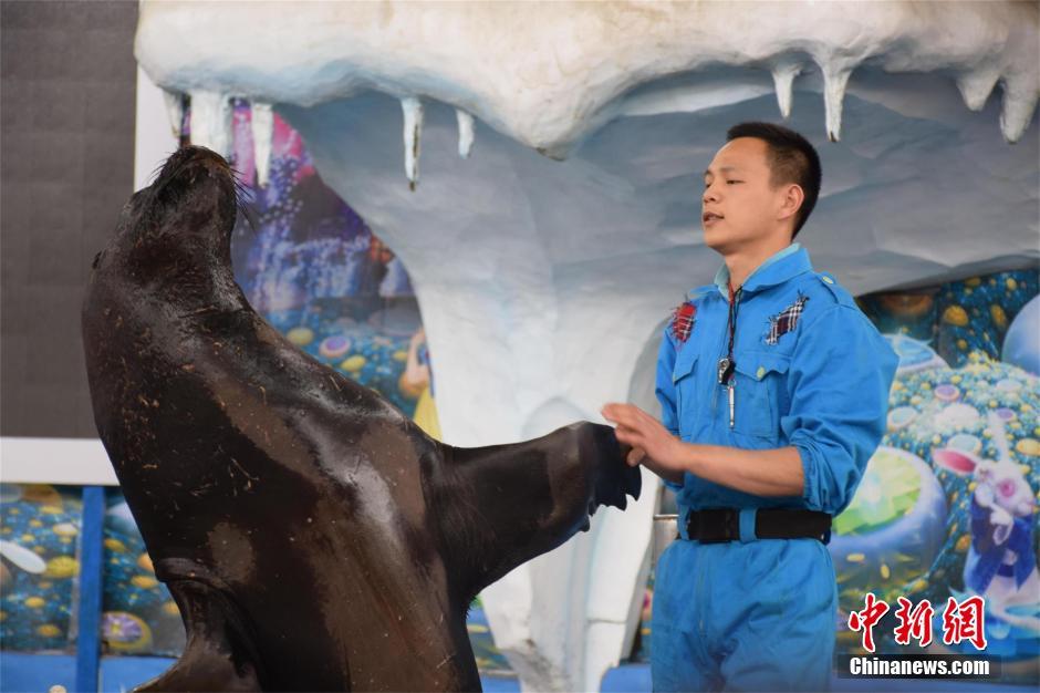 5月19日下午,武汉海昌极地海洋公园内,驯养员与海狮、海豚默契配合,奉上一场场表演逗得观众捧腹大笑。从业两年的驯养员朱思念介绍,海狮、海豚跟人一样有感情,它们会生气,会撒娇,会求安慰。跟海狮、海豚相处,需要信任、耐心,过程如同“谈恋爱”。 马芙蓉 摄