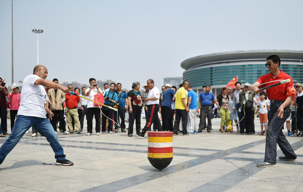 2016年5月22日,河南洛阳,河南省第五届鞭陀公开赛暨全国邀请赛上,参赛选手展示100斤打陀螺计时赛。