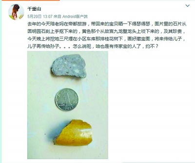 记者注意到,千重山是在5月20日发布该消息的,称:“去年的今天陪老妈在帝都旅游,带回来的宝贝晒一下:图片里的石片是从圆明园石刻上手抠下来的,黄色那个是从故宫九龙壁龙头上咬下来的,及其(极其)珍贵!今天晚上将挖地三尺埋在小区车库那排桂花树下,画好藏宝图,将来传给儿子,儿子再传给孙子。怎么说呢,咱也是有传家宝的人了。”在微博下方还配发了一张拍着两块石头的图片,一块是灰色的,一块是类似黄琉璃瓦的石片,在两块石头之间还放着一个一元钱硬币作为参照。