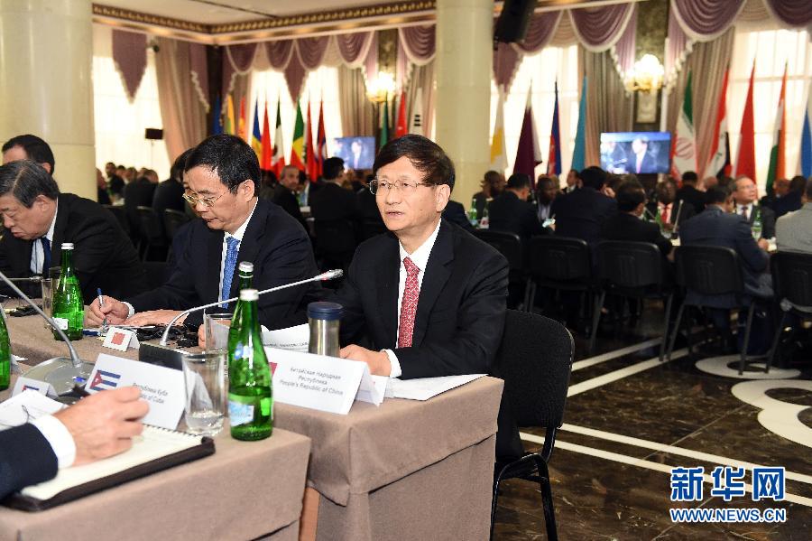5月24日,在俄罗斯车臣共和国首府格罗兹尼,中共中央政治局委员、中央政法委书记孟建柱(前右一)在第七届安全事务高级代表国际会议上发言。中共中央政治局委员、中央政法委书记孟建柱24日在俄罗斯车臣出席第七届安全事务高级代表国际会议。来自70余个国家和国际组织的代表就深化国际安全合作、有效应对恐怖主义等问题进行探讨。新华社发(郝帆摄)