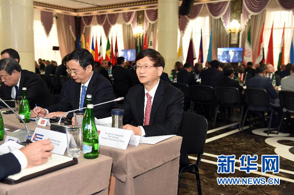 5月24日,在俄罗斯车臣共和国首府格罗兹尼,中共中央政治局委员、中央政法委书记孟建柱(前右一)在第七届安全事务高级代表国际会议上发言。中共中央政治局委员、中央政法委书记孟建柱24日在俄罗斯车臣出席第七届安全事务高级代表国际会议。来自70余个国家和国际组织的代表就深化国际安全合作、有效应对恐怖主义等问题进行探讨。新华社发(郝帆摄)