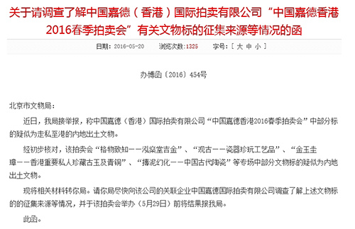 在该函中,国家文物局表示,接举报称中国嘉德(香港)国际拍卖有限公司“中国嘉德香港2016春季拍卖会”中部分标的疑似为走私至港的内地出土文物。国家文物局要求,北京市文物局尽快向该公司的关联企业中国嘉德国际拍卖有限公司调查了解上述文物标的的征集来源等情况,并于该拍卖会举办(5月29日)前将结果报国家文物局。