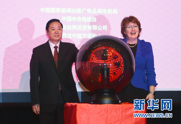5月24日,在新西兰首都惠灵顿,中共中央政治局委员、中央书记处书记、中宣部部长刘奇葆(左)出席《魅力新西兰》开播暨《魅力中国》开拍、2016新西兰中国电影周开幕式。应新西兰总理、国家党领袖约翰·基邀请,中共中央政治局委员、中央书记处书记、中宣部部长刘奇葆率中共代表团于5月24日至26日访问新西兰。新华社记者秦晴摄