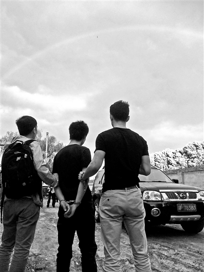 自前日傍晚北京出现彩虹网友纷纷在社交媒体上晒图开始,这张被网友誉为“堪比电影大片”的抓捕图迅速走红网络。昨日,北京青年报记者采访了这张网络大片的拍摄者——海淀公安分局刑警支队重案队的民警,为读者讲述这张被网友热赞的图片背后的故事。
