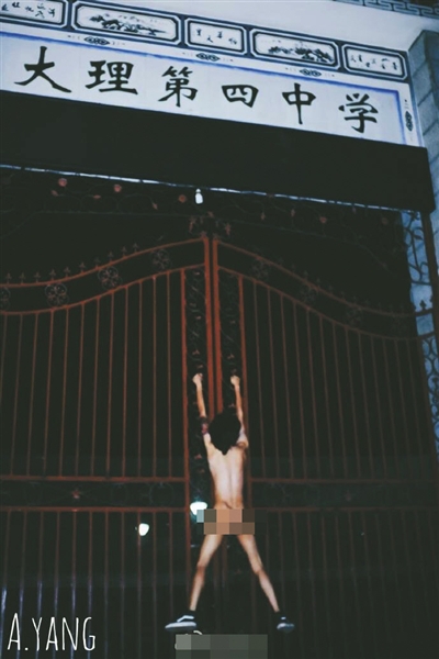 在一张照片中,男主人公双手抓着朱红色铁门跳跃离地,双腿叉开,背部全裸面对镜头,铁门上挂有大理第四中学的牌子。