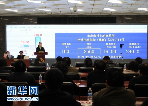 一场地票交易拍卖会在重庆市农村土地交易所举行(2010年12月3日摄)。从2008年开始,重庆以农村宅基地为突破口,引导农村土地流转,创造性地发明了“地票”交易制度。从此,农村宅基地可以化身城市建设用地指标“入场券”,成了工业化和城镇化主战场的“香饽饽”。一张“地票”,犹如棋盘上落下的一枚关键棋子,一招棋到,满盘皆活。小小“地票”缘何如此神奇? 新华社记者 陈诚 摄