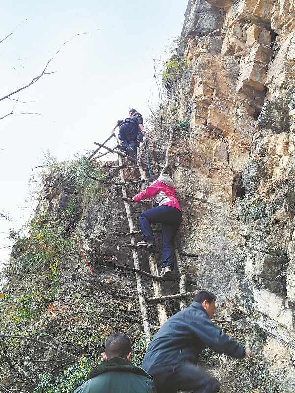 山村看起来不高,但地势险要,村民往返村寨,要攀爬落差达800米的悬崖。最近的一条山路,长约4公里,其中有13处峭壁,攀爬全靠藤梯。一些惊心路段,能下脚的地方不到手掌大。