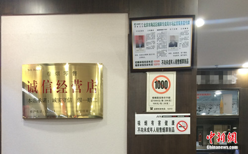 北京某零售商户张贴了“吸烟有害健康”等标识。中新网邱宇 摄