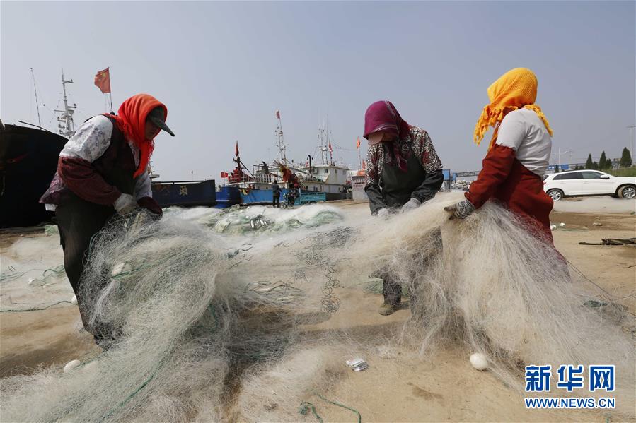 5月30日,在江苏连云港市赣榆区青口港,渔民们整理渔具准备休渔。 6月1日12时起,我国黄渤海、东海海域将全面进入伏季休渔期。新华社发(司伟 摄)
