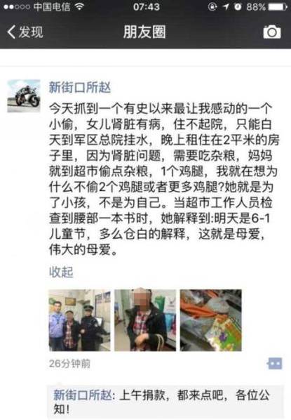 刘金霞的话触动了民警。” 这是我有史以来遇到的最让我感动的小偷。” 潘顺勤说,他将这件事发到了微信朋友圈上,并倡议大家给孩子捐款捐物。