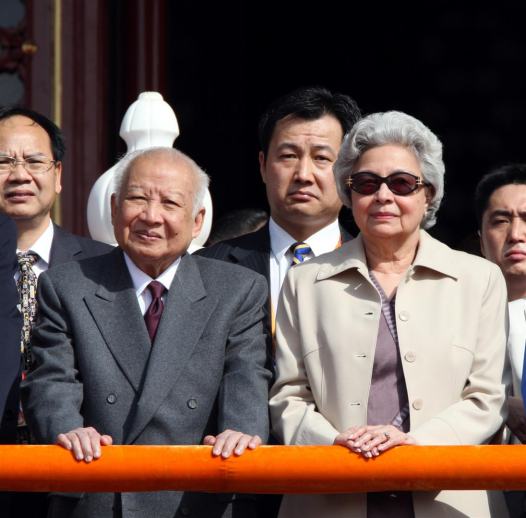 2009年10月1日,首都各界庆祝中华人民共和国成立60周年大会在北京天安门广场隆重举行。这是柬埔寨太皇西哈努克、太后莫尼列在天安门城楼上。(新华社记者 姚大伟摄)