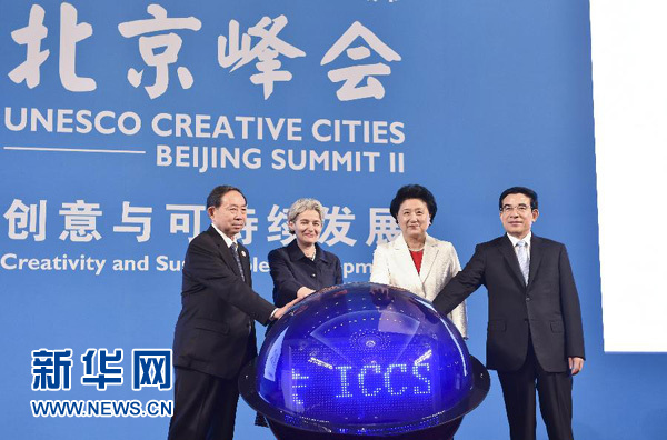 6月6日,中国国务院副总理刘延东出席第二届联合国教科文组织创意城市北京峰会开幕式,与教科文组织总干事伊琳娜·博科娃共同启动峰会。新华社记者高洁摄