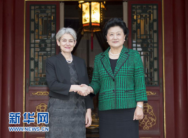 6月5日,国务院副总理刘延东在北京会见联合国教科文组织总干事伊琳娜·博科娃。 新华社记者谢环驰摄