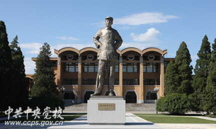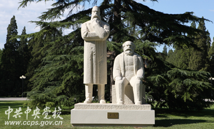 有时想,这院子里似乎缺少些什么,但认真想时,又说不出。只是到了今年夏末的一天,随着一尊尊雕塑的出现,心中的疑问才得以破题。这个院子近千亩,从南向北,呈长方形。从中国古建筑来说,算是三进院子。进了南门不远,是主楼,算是一进;往北300米,是大礼堂,算是二进;再行300米是现代化的综合楼,算是三进。中轴线上,如今从南到北立了三组雕塑。进了大门,不远处的花岗岩是校名碑。“中共中央党校”六个大字,提醒着走进院子的人,您已走进了中国共产党的最高学府。穿过巍峨的主楼,就在右侧,主楼背后的草地上,依然是中轴位置,花岗岩的马克思、恩格斯雕塑屹立在那里。这时你就会自然而然地想到这个院子的历史、党校的历史以及党校的使命。这是一个宣传马克思主义的院子,在新中国成立前后一段时间,也曾直接叫“马列学院”。马克思、恩格斯,这确实是最能够、也是最应该在这里见到的两位革命导师、两位哲学先贤啊。