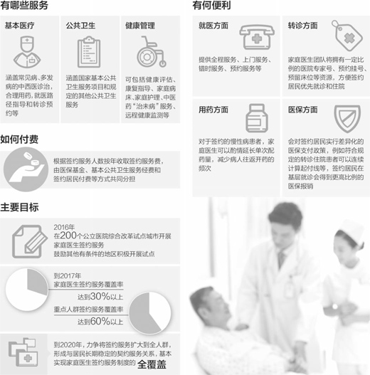 国家卫计委有关负责人指出,居民在签约后,将享受到家庭医生团队提供的基本医疗、公共卫生和约定的健康管理服务。基本医疗服务涵盖常见病、多发病的中西医诊治,合理用药,就医路径指导和转诊预约等。公共卫生服务涵盖国家基本公共卫生服务项目和规定的其他公共卫生服务。健康管理服务主要是针对居民健康状况和需求,制定不同类型的个性化签约服务内容,可包括健康评估、康复指导、家庭病床、家庭护理、中医药“治未病”服务、远程健康监测等。通过不断优化签约服务内涵来满足居民的多样化医疗卫生服务需求。