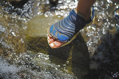 大约行走了4个小时,经过一个小溪时,6岁的吉克成业脱下鞋把脚泡在水里。