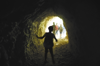 孩子们经过一个长约50米的隧洞。