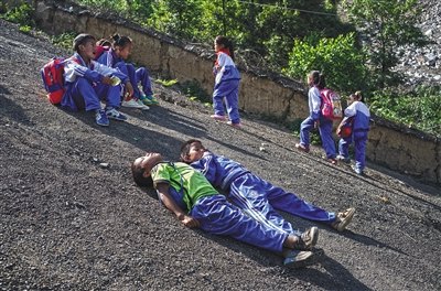 12时35分许,孩子们出门约6小时,踏上了平坦的307省道。10岁的俄地曲坡得到爸爸奖赏的一个真空包装的瘦小鸡腿,他一边啃一边说“这路走得太累了,腿已经不行了,以后打死也不走这样的路了。”