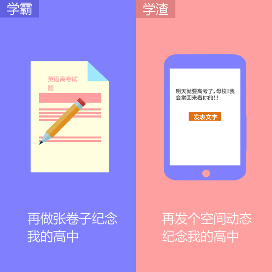 有多少人在看到标题的一秒,已经脑补了当年高考前的场景。中新网图解新闻“图啥”栏目总结了学霸和学渣在高考前一天不同的想法,哪个点戳到了你?