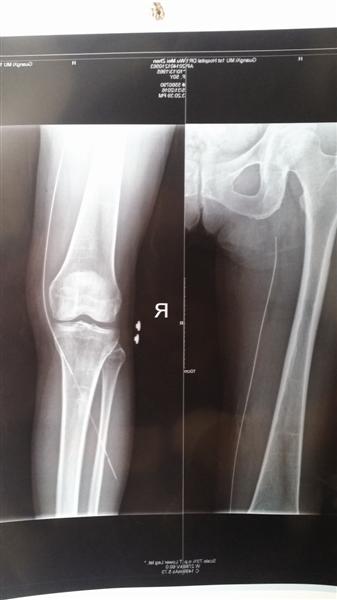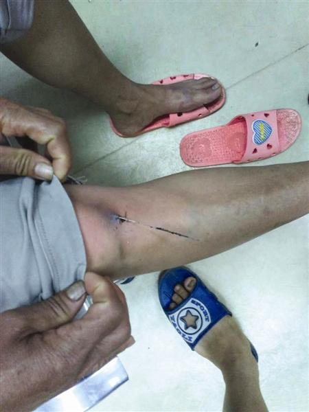 “不痛不痒,就感觉到有点东西在里面。”吴女士接着说,当时出院后,一些小毛病也没在意,最近半年,因为带孙子,频繁做一些下蹲动作,感觉更加明显。5月30日下午,再一次下蹲抱孙子的过程中,膝盖附近突然一阵剧痛,撸起裤腿一看,满腿是血,一根“铁丝”刺了出来。