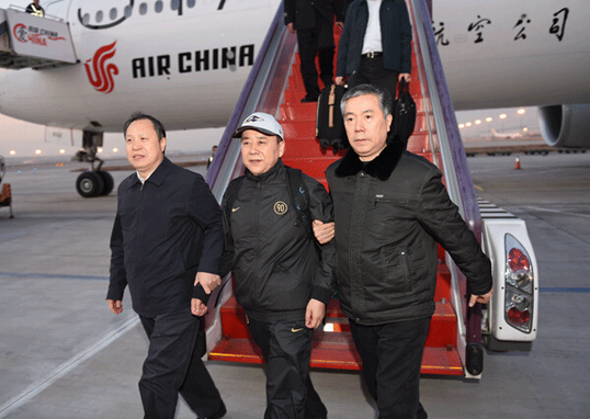 2014年12月22日,王国强(中)回国投案自首,到达首都机场。中央纪委监察部网站 李放摄