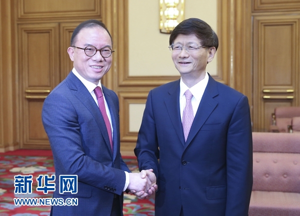 6月15日,中共中央政治局委员、中央政法委书记孟建柱在北京中南海会见香港特别行政区入境事务处处长曾国卫。 新华社记者姚大伟摄