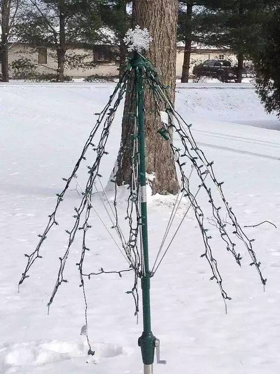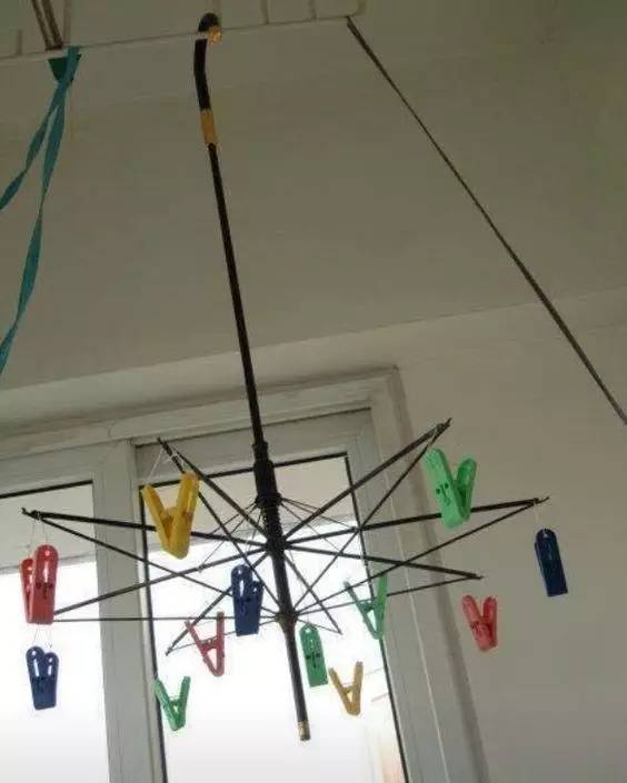 拆下伞面,留下伞柄和伞骨,系上夹子。用来晾晒内衣和袜子也是极好的。