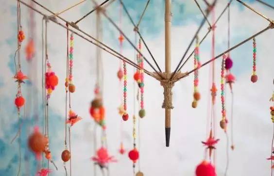 孩子儿时用的小伞,也别扔了。用线串上几何图案或千纸鹤,做成风铃挂在家里很好看。