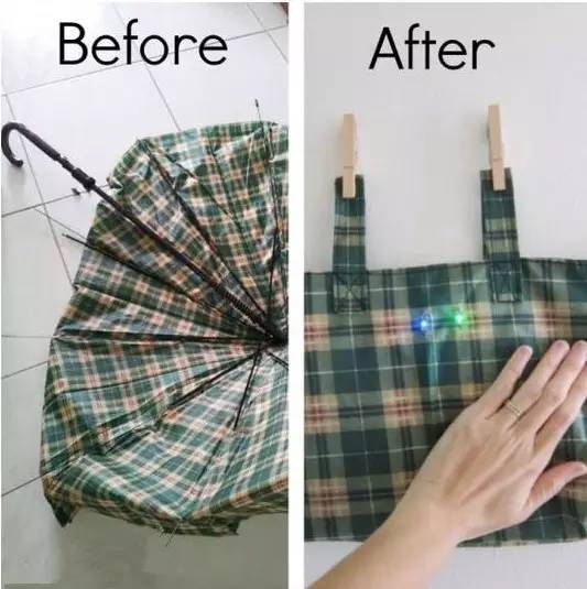 把伞面拆下来对折,剪成长方形(或任何你喜欢的形状)后缝合。最后用多余的边角料做成背带,既可以装东西,还可以防水哦。