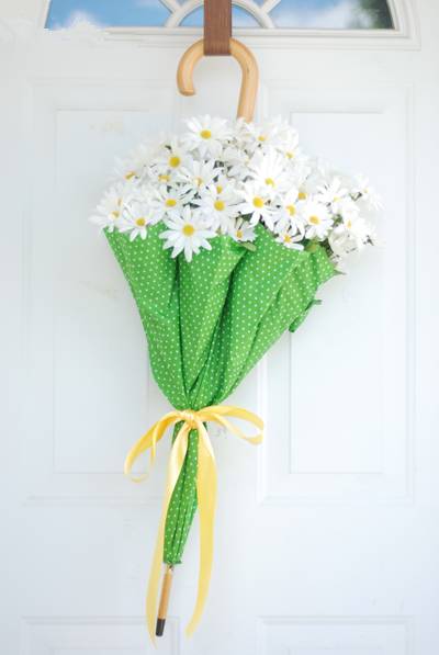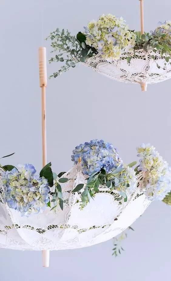 拆下伞骨,留下伞柄和伞面,放进几枝鲜花或干花后,在伞的中间绑一个蝴蝶结。一个漂亮的花束就做好啦。