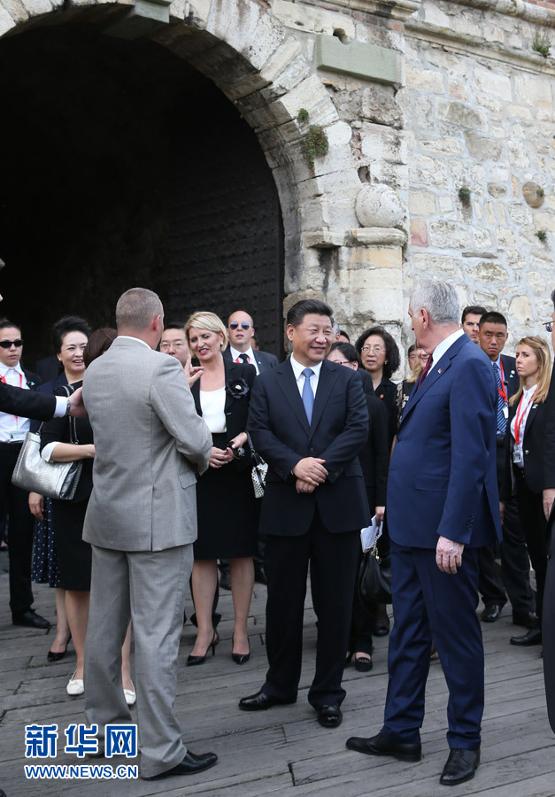 6月17日,中国国家主席习近平和夫人彭丽媛在塞尔维亚总统尼科利奇夫妇陪同下参观具有悠久历史的贝尔格莱德卡莱梅格丹公园。 新华社记者马占成 摄