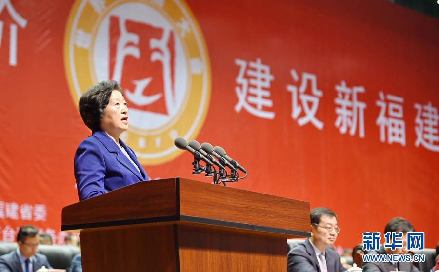 6月15日至18日,中共中央政治局委员、中央统战部部长孙春兰在福建参加第五届世界闽商大会并进行调研。这是6月18日,孙春兰在第五届世界闽商大会上讲话。新华社记者 林善传 摄
