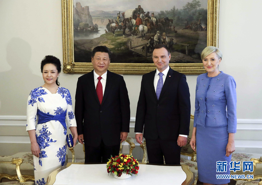 6月20日,国家主席习近平出席波兰总统杜达在华沙总统府举行的隆重欢迎仪式。欢迎仪式后,习近平和夫人彭丽媛同杜达和夫人阿加塔简短寒暄。新华社记者 兰红光 摄