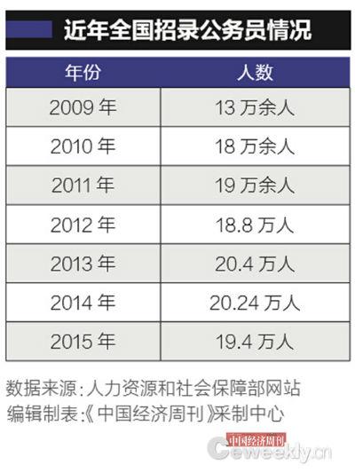 公开数据显示,从2009年到2015年,全国共录用公务员人数分别为13万余人、18万余人、19万余人、18.8万人、20.4万人、 20.24万人、19.4万人。其中,2014年、2015年连续两年下降。2015年下降更多,比最高年份的2013年下降了1万人,也创下公务员国考 的报名人数和录用人数3年以来的新低。