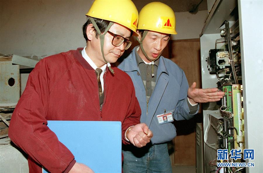 徐虎(左)在攻读高级电工技术期间,到大楼电梯安装现场向工人请教(资料照片,1997年)。一辆“老坦克”(破旧的自行车)、一个“全天候”报修箱,一副大大的黑框眼镜,一张真诚的笑脸,十几年风雨无阻地穿梭在弄堂街坊——上世纪90年代,一位上海普通水电修理工感动了中国。他叫徐虎,利用空闲时间义务为居民服务,被亲切地称作“晚上七八点钟的太阳”。 “我只是一个普通人,在为群众服务的平凡岗位上做了点平凡的事,我的确放弃了一些物质上的东西,但我的精神世界无比丰富。”徐虎说。新华社记者张耀智摄