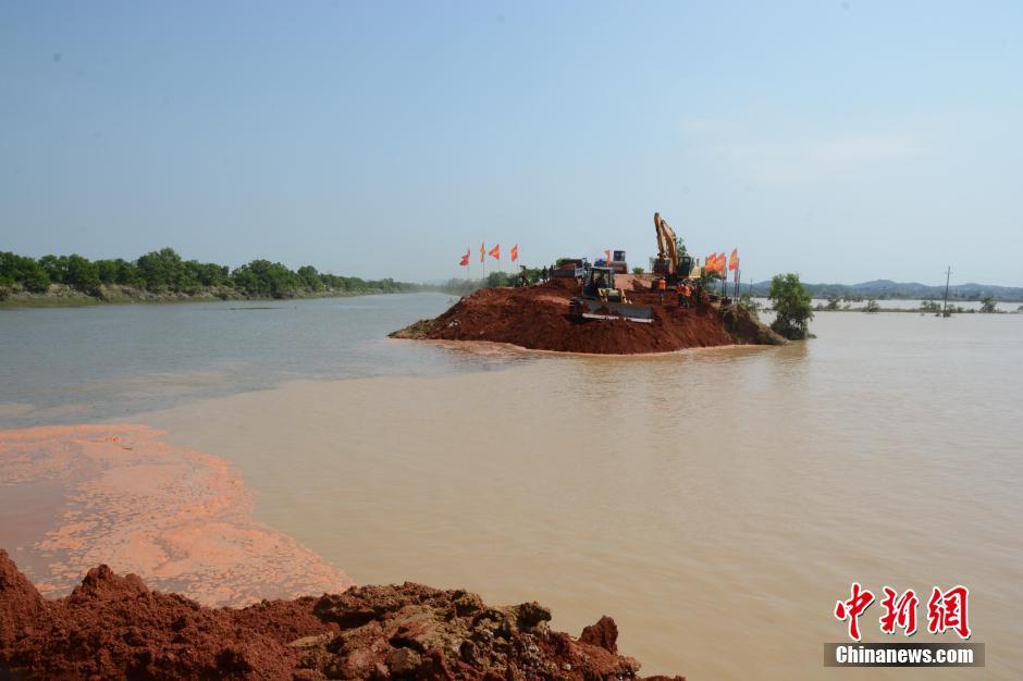 6月20日晚,因昌江水位急剧上升、昌江洪峰通过等叠加作用,位于鄱阳湖东岸的鄱阳县昌江支流滨田河向阳圩发生宽65.7米的溃口,1.3万人被紧急转移,1.03万亩良田被淹。图为河堤决口封堵现场,中国武警水电二总队官兵采用机械化双向推进作战。图为不断缩小的河堤决口现场。 中新社记者 钟新 摄